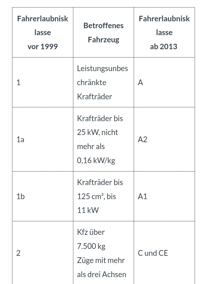 Tabelle: Gegenüberstellung der Fahrerlaubnisklassen vor 1999 und ab 2013