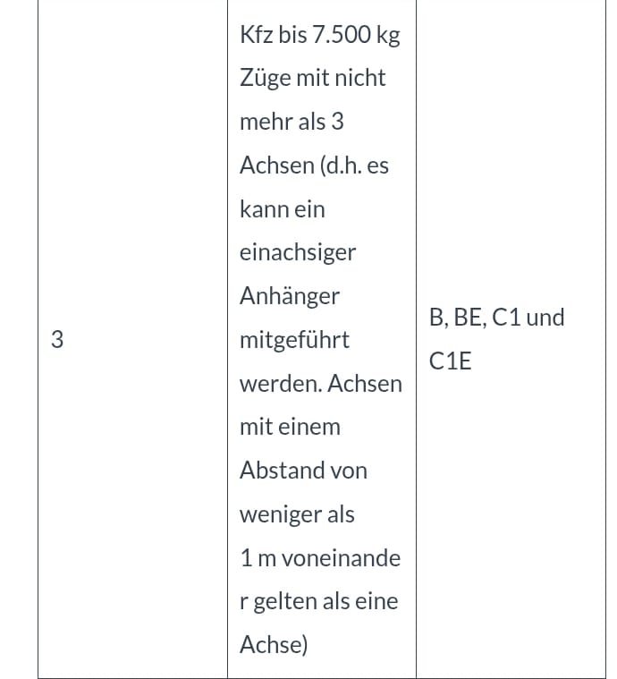 Zugfahrzeug der Klasse B in Kombination mit einem Anhänger mitzulässiger Gesamtmasse des Anhängers von mehr als 750 kg undzulässiger Gesamtmasse der Fahrzeugkombination von mehr als 3.500 kg und nicht mehr als 4.250 kgDie Fahrerlaubnis der Klasse B berechtigt auch zum Führen von dreirädrigen Kraftfahrzeugen im Inland, im Falle eines Kraftfahrzeuges mit einer Motorleistung von mehr als 15 kW jedoch nur, soweit der Inhaber der Fahrerlaubnis mindestens 21 Jahre alt ist.